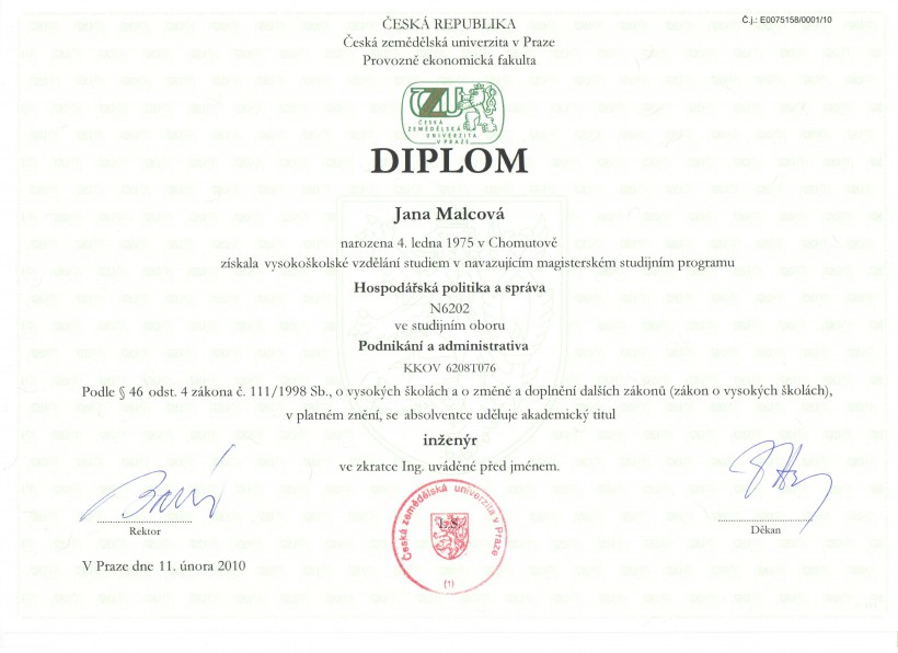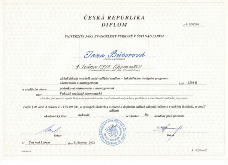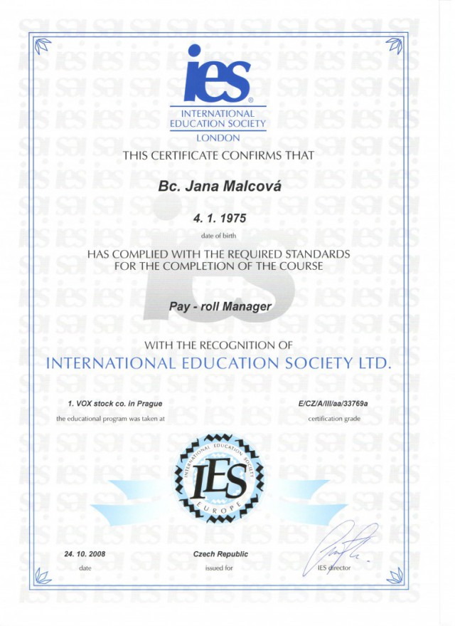 Mám vysokoškolské vzdělání ekonomického zaměření ukončené státní zkouškou a přijetím titulu Ing. Dále jsem si chtěla prohlubovat praxi a kvalifikaci, proto jsem absolvovala kurz Mzdový auditor a zíkala mezinárodní certifikát.